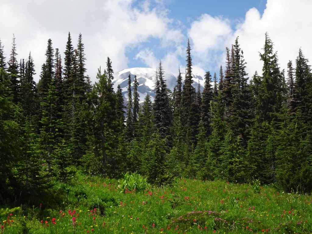 Up the Worm Flows…Vine Maples beginning to turn orange.A few flowers along the rocky trail.A glimpse of the top of Mt St Helens beyond the clouds.We went just high enough to get the full mountain view.Zooming in on a glacier near the summit ridge.The trail not taken ahead – our knees and balance had enough for the day.