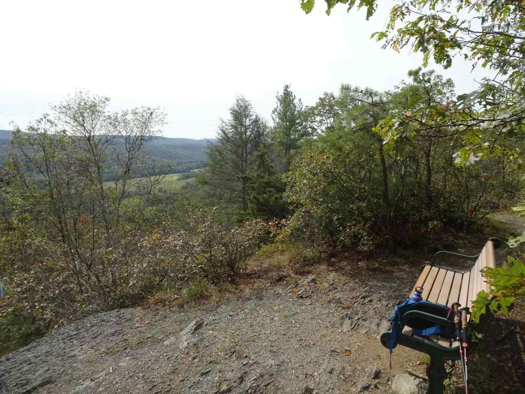 Visitor Center, Delaware Water Gap. We would see this view of Mt Tammany later in the day.The Tumbling Falls Trail – a 3 mile, 400 foot loop, through pine and oak forest.Old stone fireplace along the trail.Bench with a view for lunch.Lunch view across the Delaware River to the Jersey side.Tumbling Falls – just a trickle this time of year.Nice reflections in the pool.Stairs back up…Pickerel Pond, near the trailhead. Again, just the beginning of fall color on the trees.