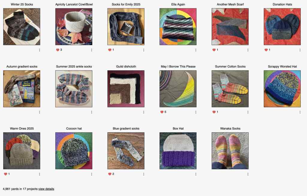 I finished 17 projects in 2025, including nine donation items, mostly hats.