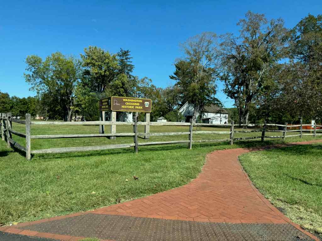 We crossed the river on an auto bridge, looking toward the Washington Crossing. The park has wide green fields on both sides of the river – plenty of room for the annual reenactments that happen here.A plinth tribute to George Washington stands along an avenue, with flags of the colonies.George Washington atop his plinth.We sat on a bench to eat our lunch, with this lovely view of the crossing. There is a very nice path along the river, and more construction was underway.On the night of December 25th, 1776, there was a blinding snowstorm here, and the Delaware River was choked with ice. The Continental Army successfully crossed, despite the conditions, and went on to defeat the Hessians in Trenton.Today there are only geese and ducks swimming around.We stepped briefly into the Visitor Center, just long enough to see George, and a nearby plaque honoring Thomas Paine.“Tyranny, like hell, is not easily conquered.”…words for the ages.