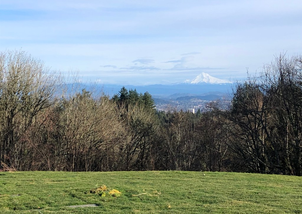 February 4, West Hills Long Walk – It was almost seven miles, and 900 feet elevation, all on pavement, sometimes on busy roads, sometimes across one of several cemeteries that are on the tops of the West Hills. Our friends who live in the neighborhood guided us, as this is their regular walking area. Not my favorite kind of walking, because of the traffic and the pavement, and it turned out to aggravate my hip bursitis, which I am still feeling, darn it! But we did enjoy the time with our friends, and the views across the city.