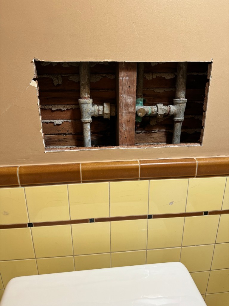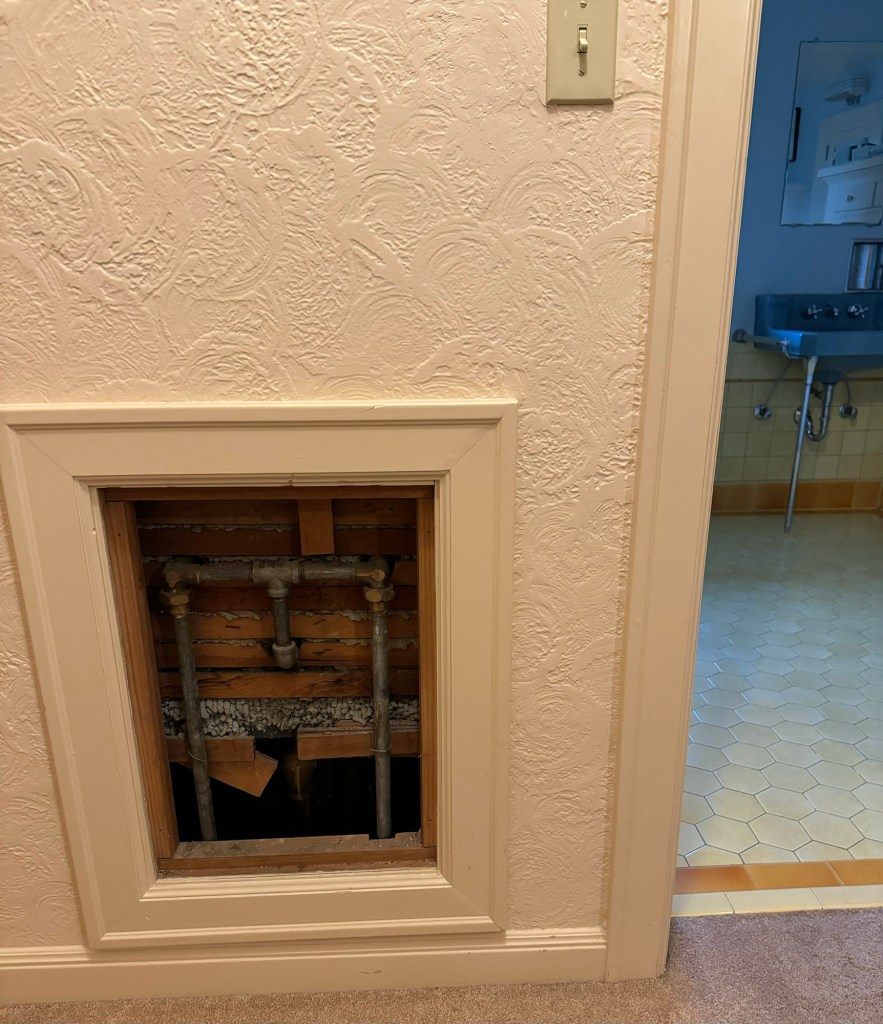 Plumbing!… In December we had a leaky pipe that created a small flood in our basement – we found it and had it fixed before too much damage was done, but it prompted us to replace the 92 year old pipes that run through most of our house. We are currently experiencing the dust and noise created by cutting through plaster and tile – very efficiently, but still not pleasant. Then there will be the patching and painting. Meanwhile, we get a peek inside the walls of our house, which has very good bones…