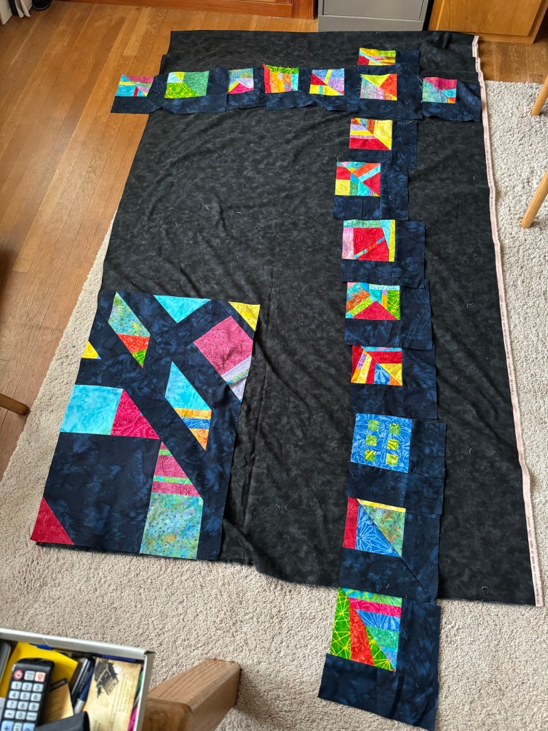 I am improv piecing the back for my Lodge Quilt, which I made from the Modern Quilt Studio summer mystery quiltalong, using the leftovers from that top. I enjoy the process of improv piecing so much more than the extremely precise sewing and point matching required for the Transparency quilt, but both techniques have their place.
