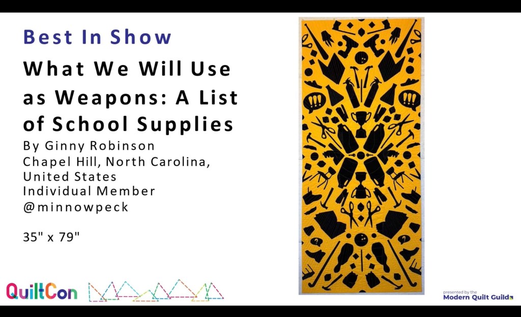 I did not attend the Quilt Con show in North Carolina. I enjoyed looking at the images on Instagram, and was moved to tears by their Best in Show quilt. The artist, a teacher, crowd sourced the items shown from other teachers, and created this piece. (Images from Instagram)