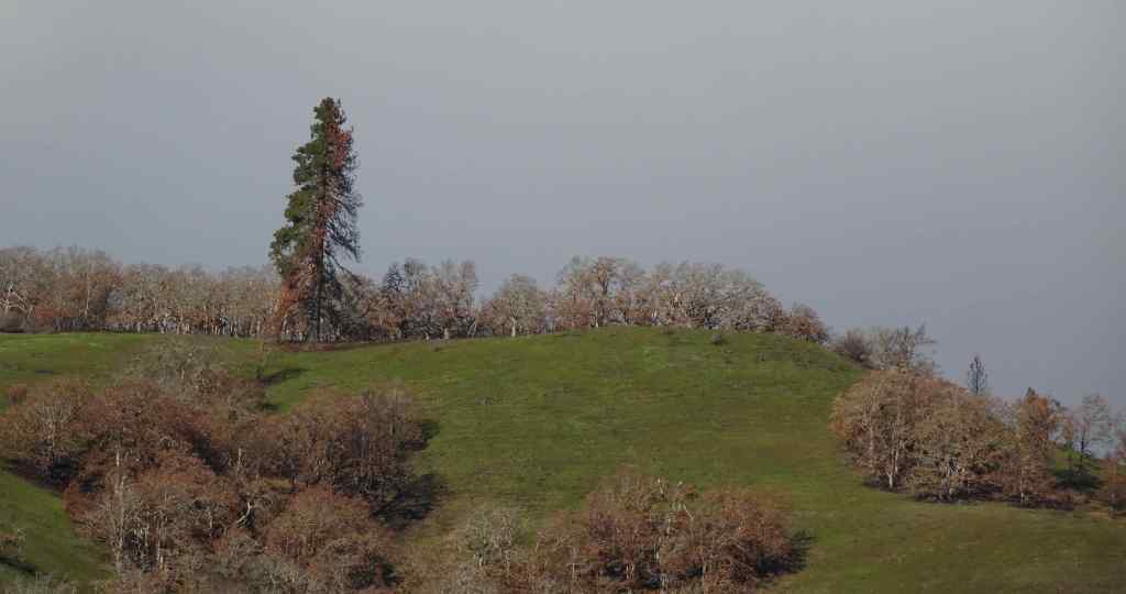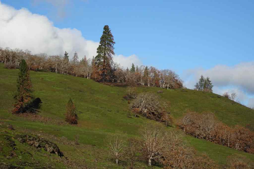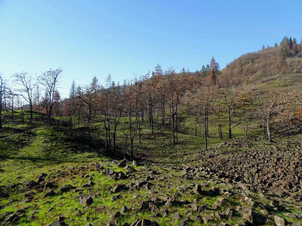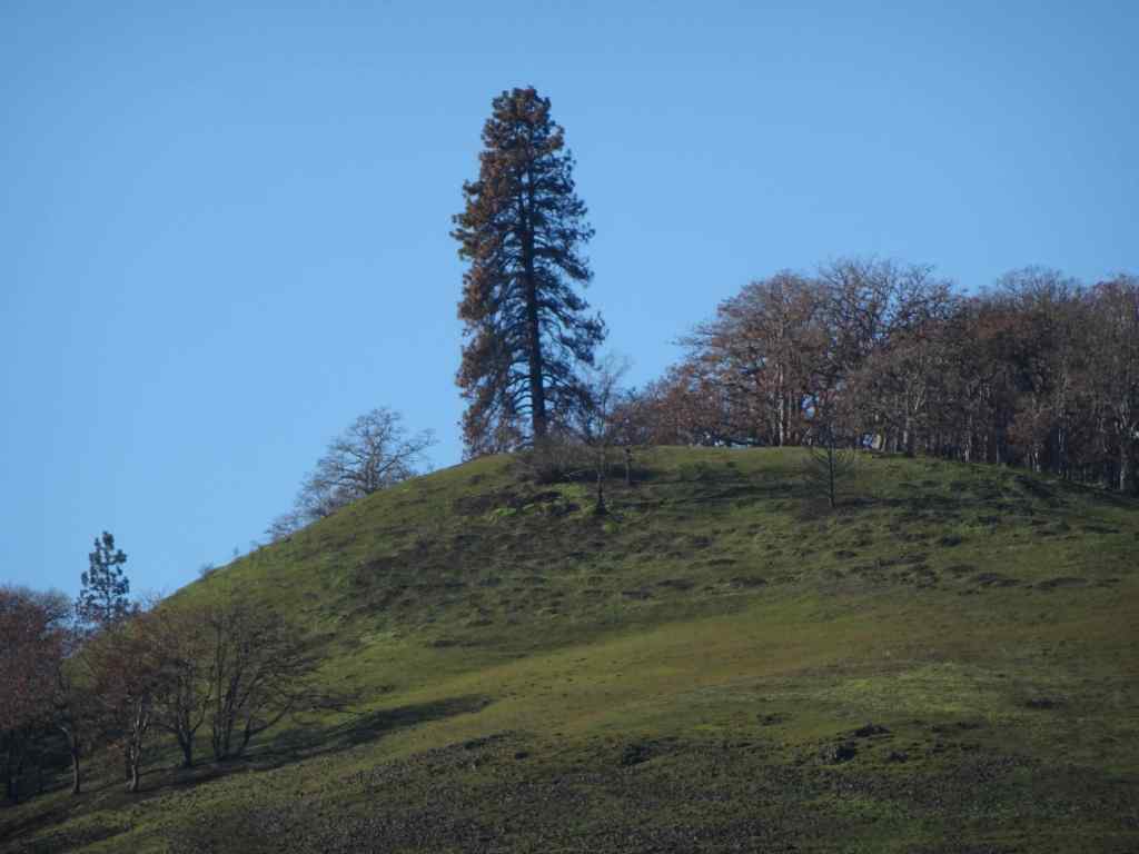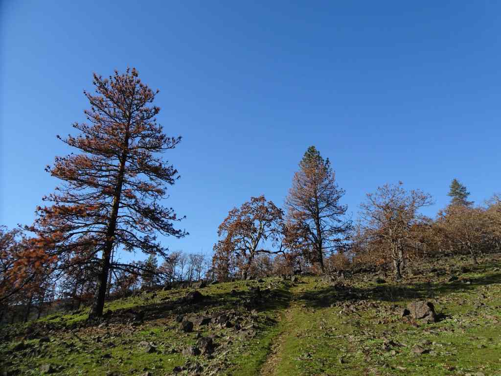 Looking up to the guide Ponderosa Pine tree above the Rowland Lake Trailhead.Zooming in, I can see it is partially burned.The waterfall – quite full this time of year.Hiking upward through the mosaic burn…The burned areas are sprouting new grass.My favorite oak grove is scarred, but trees are still standing.View upriver from our lunch ledge.The ridgeline oak tree is intact.We didn’t get all the way to the guide tree on this day, but zooming in, I can see it is less burned on the west side.