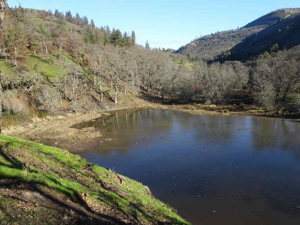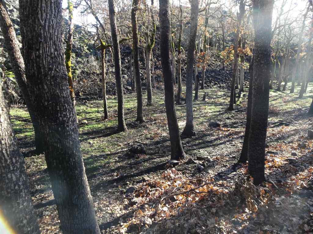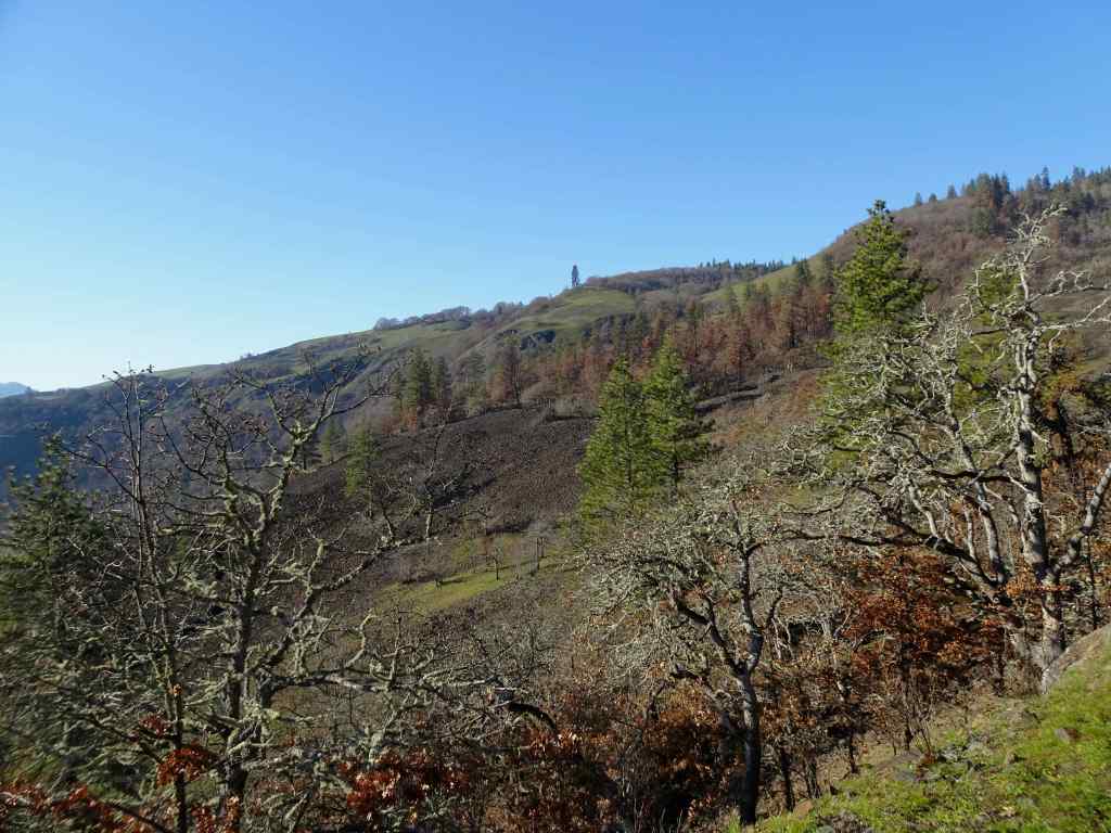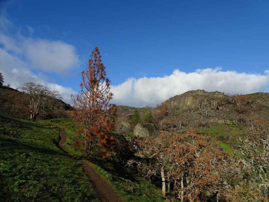 Looking up to the guide Ponderosa Pine tree above the Rowland Lake Trailhead.Zooming in, I can see it is partially burned.The waterfall – quite full this time of year.Hiking upward through the mosaic burn…The burned areas are sprouting new grass.My favorite oak grove is scarred, but trees are still standing.View upriver from our lunch ledge.The ridgeline oak tree is intact.We didn’t get all the way to the guide tree on this day, but zooming in, I can see it is less burned on the west side.