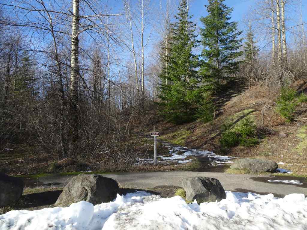 Trailhead. The burned slope here is turning green.We found a few clumps of early grass widows along the ADA trail south of the road. This area did not burn.Catherine Creek waterfall viewpoint.