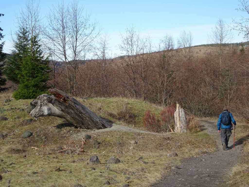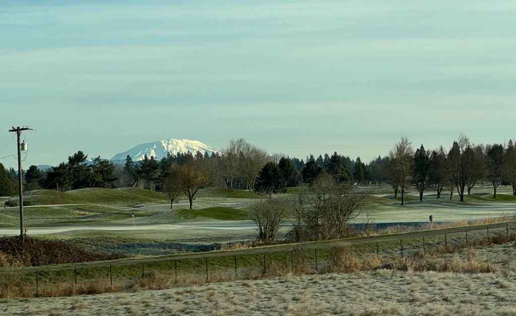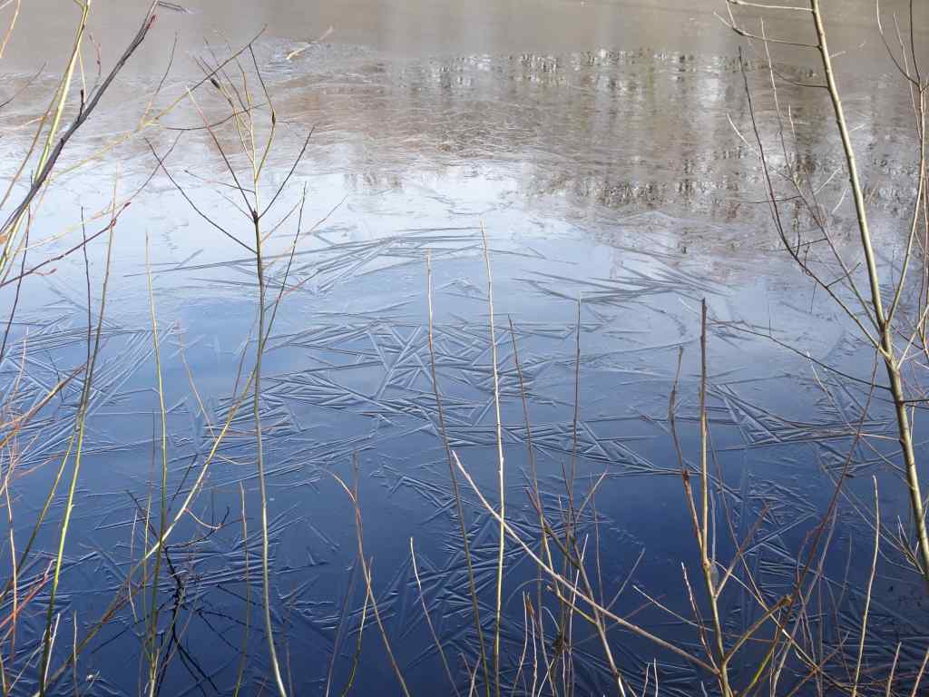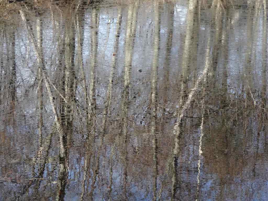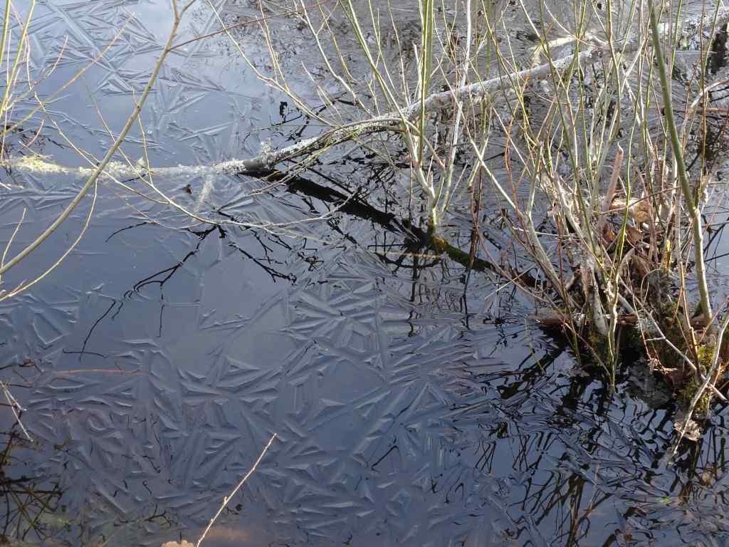 Mt St Helens, as seen from I-5 as we drove north.Snow in the parking lot. The trail was mostly clear. The trail winds around through hills of volcanic debris that were completely barren after the eruption in 1980. Forty five years later, the hummocks are covered with vegetation and there are many lakes and ponds throughout this landscape.On this day the lakes were partially frozen.I was fascinated by geometric patterns in the ice, apparently caused by differential melting due to plant shadows.More ice patternsSnow patches along the trail.Groves of alder trees have filled in much of the landscape.Alder treesToutle River Overlook – this downstream landscape is unstable and constantly changing.Another pond with tree reflections.Tree reflectionsJunction with the Boundary Trail, toward Johnston Ridge…into the wind we go.The trail switchbacks up onto the ridge on the left, toward Johnston Observatory, with great views of the northwest side of Mt St Helens.View from our turnaround point…the wind was getting stronger the further east we went.Closer view of the summit on this side.The return loop passes by this inverted tree, still buried where it landed in May, 1980.And one more reflective pond picture…