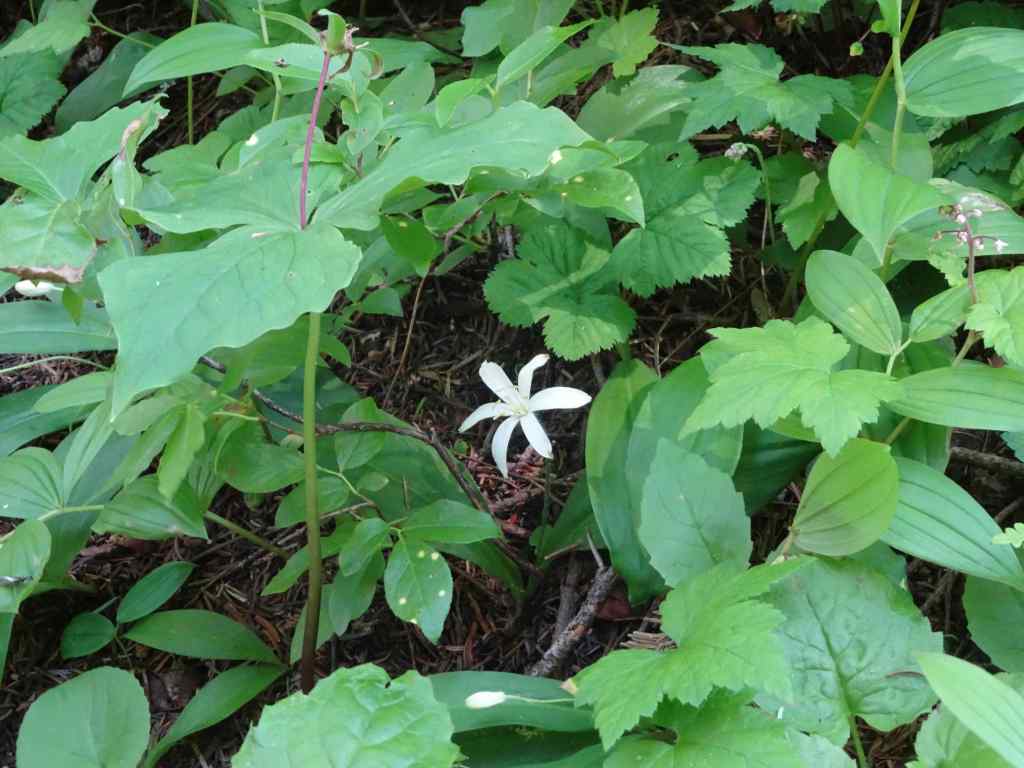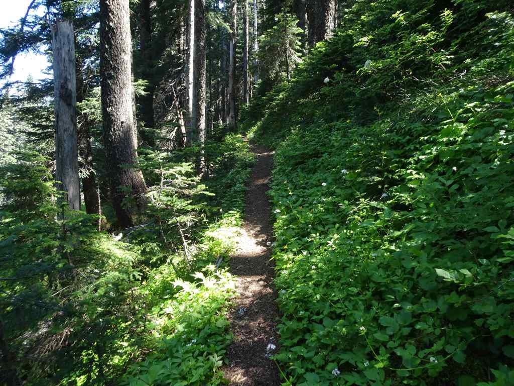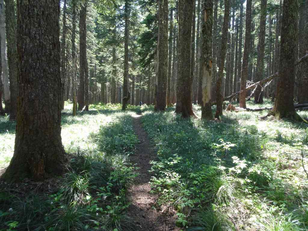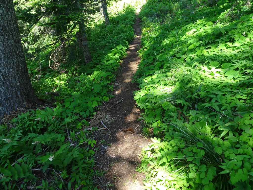 Beargrass along the trail as we start uphill.Green forest floor with so many flowers the entire way. Lots of vanilla leaf in this section.BunchberryStarry solomon sealBleeding heartAvalanche liliesBeargrassRosy twisted stalkContinuing shaded trail with prolific Sitka valerianQueen cup lilies just beginning to openSitka ValerianWindflowers