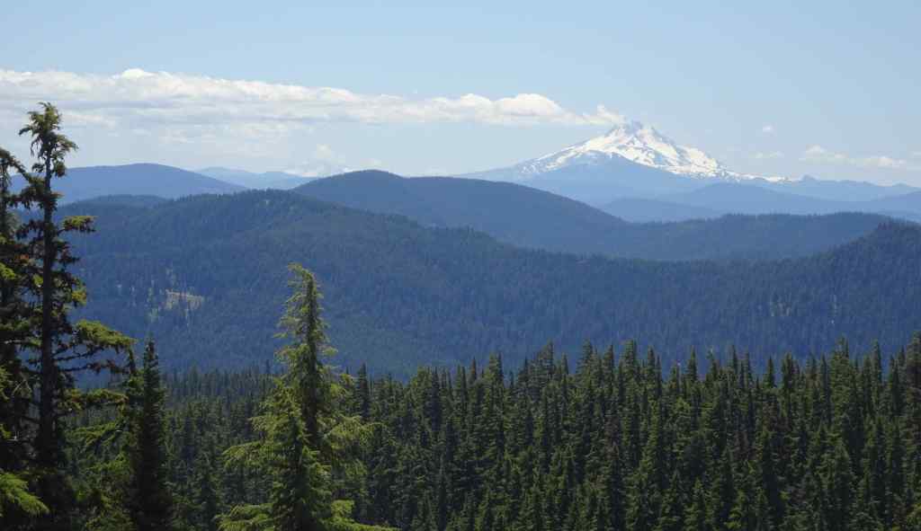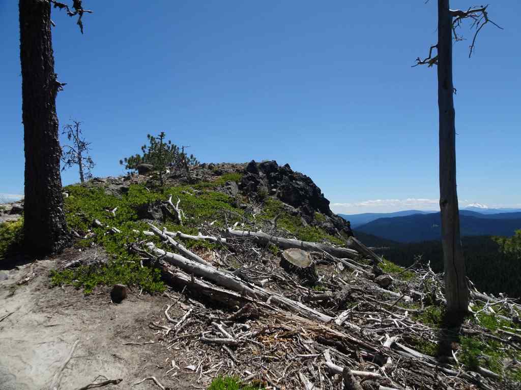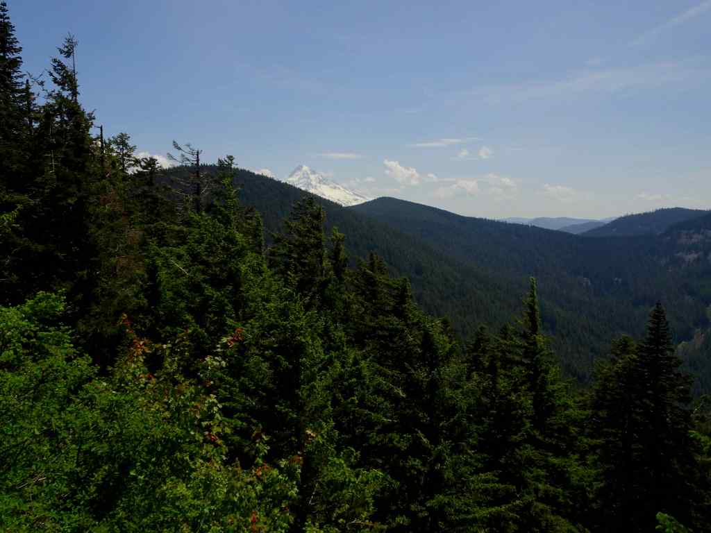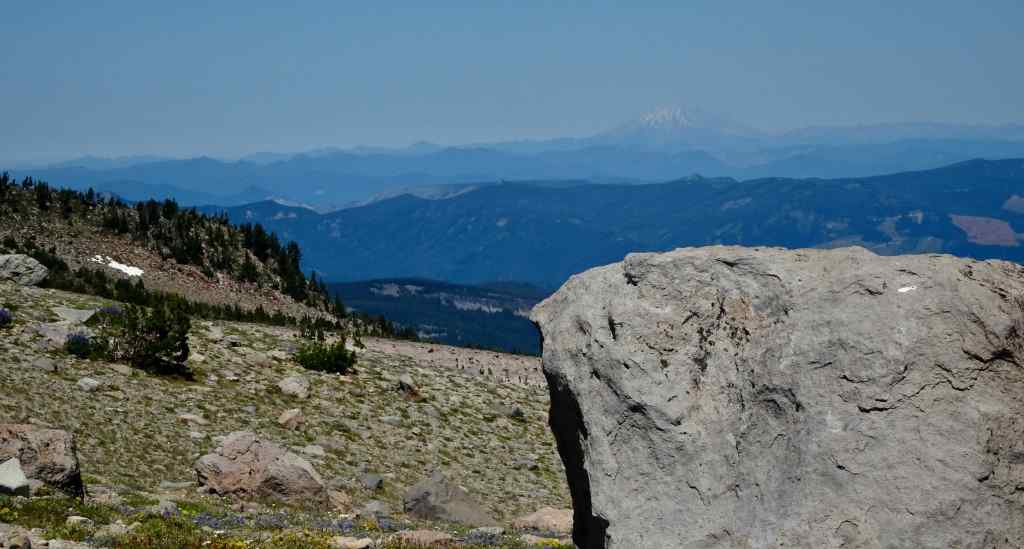 Near the ridge crest, a rocky view opened up, back to Mt Hood and Wahtum Lake.
