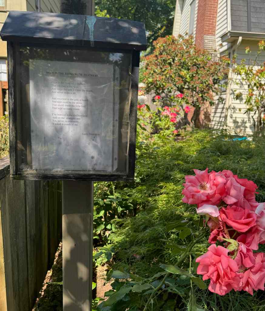 I also looked at each poetry post – today there was Emily Dickinson‘s, ‘Hope is a thing with feathers’, on one signpost. My favorite poetry post, the one I never miss if I am up in that neighborhood, had a very hopeful, expressive poem today for these terrible times we are living in, with the authoritarian effort to crush anything progressive, kind, diverse, multicultural, and human in our country.