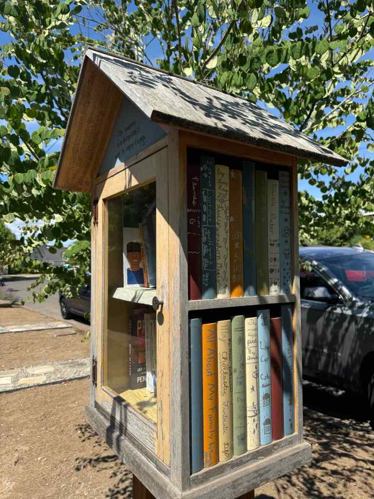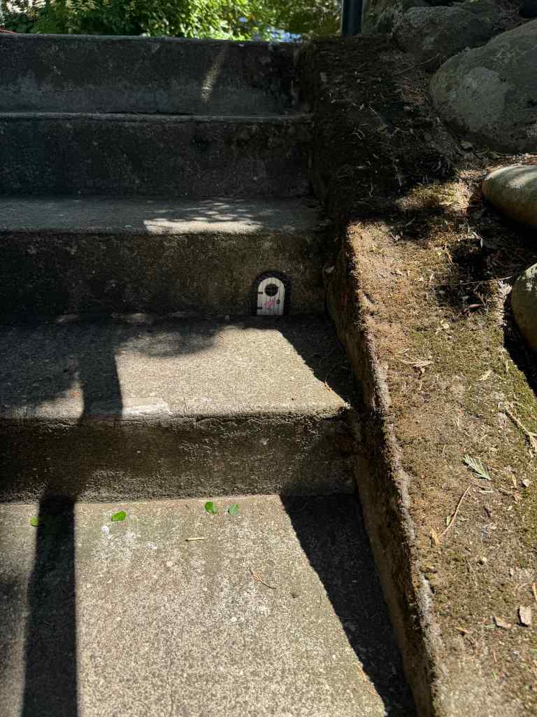 Today I walked my way up the hill, and noticed all the whimsy throughout my neighborhood. It is part of the keep Portland weird vibe. Little doors on trees, little houses under bushes, interesting little signs painted on the sidewalk stair cases of Alameda. Little free libraries throughout my neighborhood.