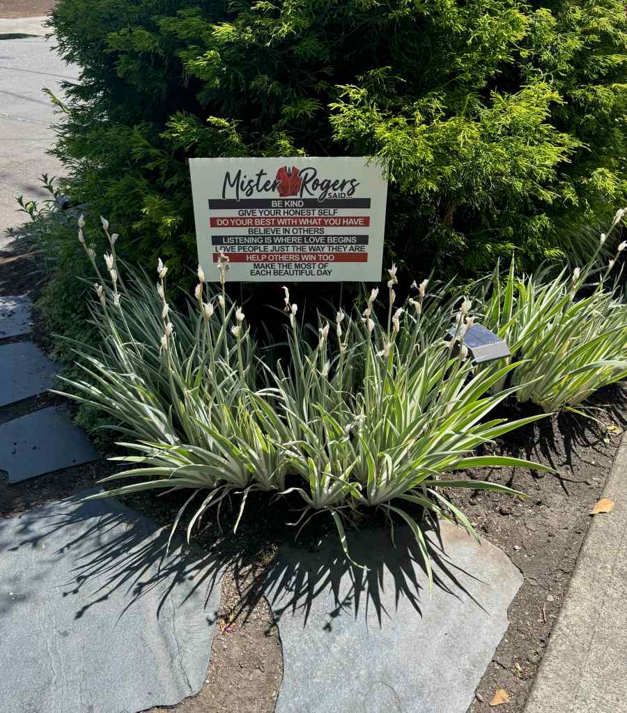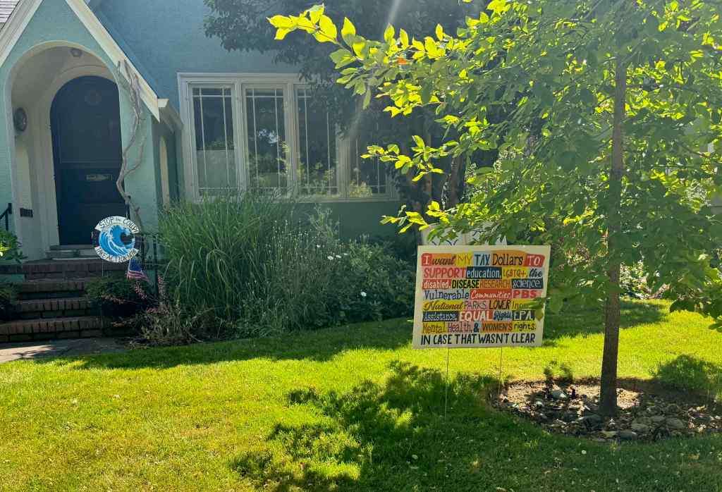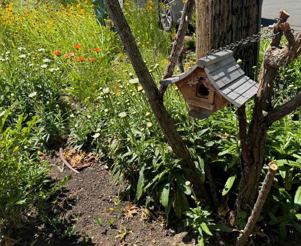 How positive those signs are to me just wandering my way through the neighborhood on a beautiful early summer day with flowers blooming everywhere. Birdfeeders and gnome doors and buckets of water on offer for the dogs; signs and flags and symbols of inclusion and acceptance and community. Our quiet mostly white, mostly financially stable neighborhood is not in the firing line of ICE raids, but I have seen my neighbors going to the demonstrations and standing in the space to support the resistance.
