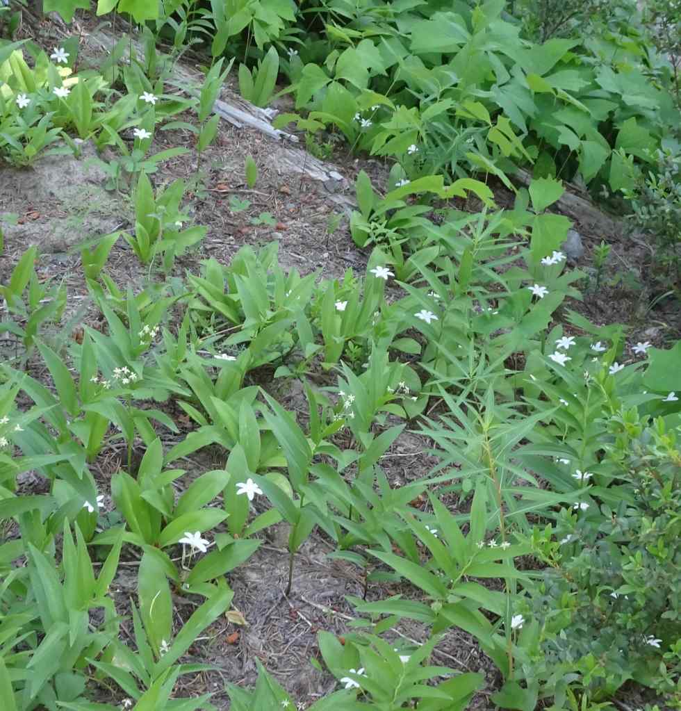The Anthill Trail begins above the parking area, and continues upward at a gentle gradient along the ridge above the lake. It is beautifully shaded, and on this June day, all the white flowers of the forest floor were sparkling up at us. This is a new addition to my list of favorite trails.