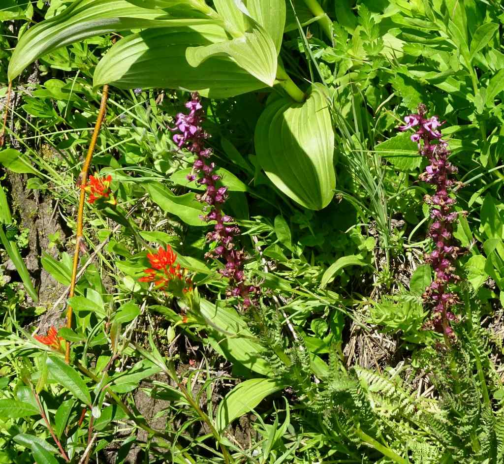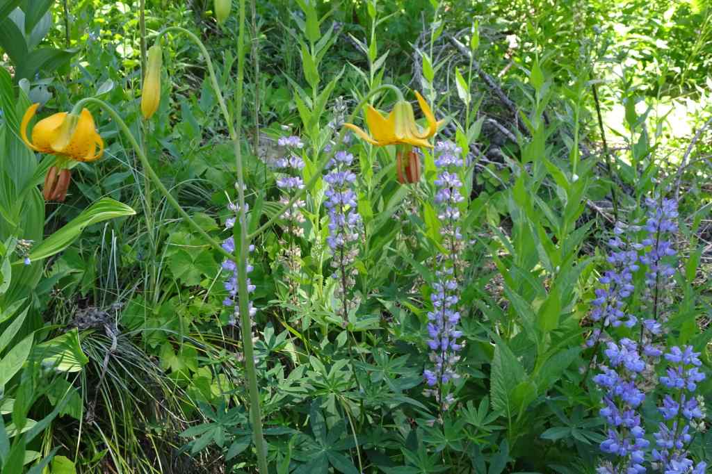 Uphill meadows – penstemon and lupineWashington liliesBead lilies and Solomon sealLupine and tiger liliesMarsh marigoldTrillium and violetsPaintbrush and Elephant’s head