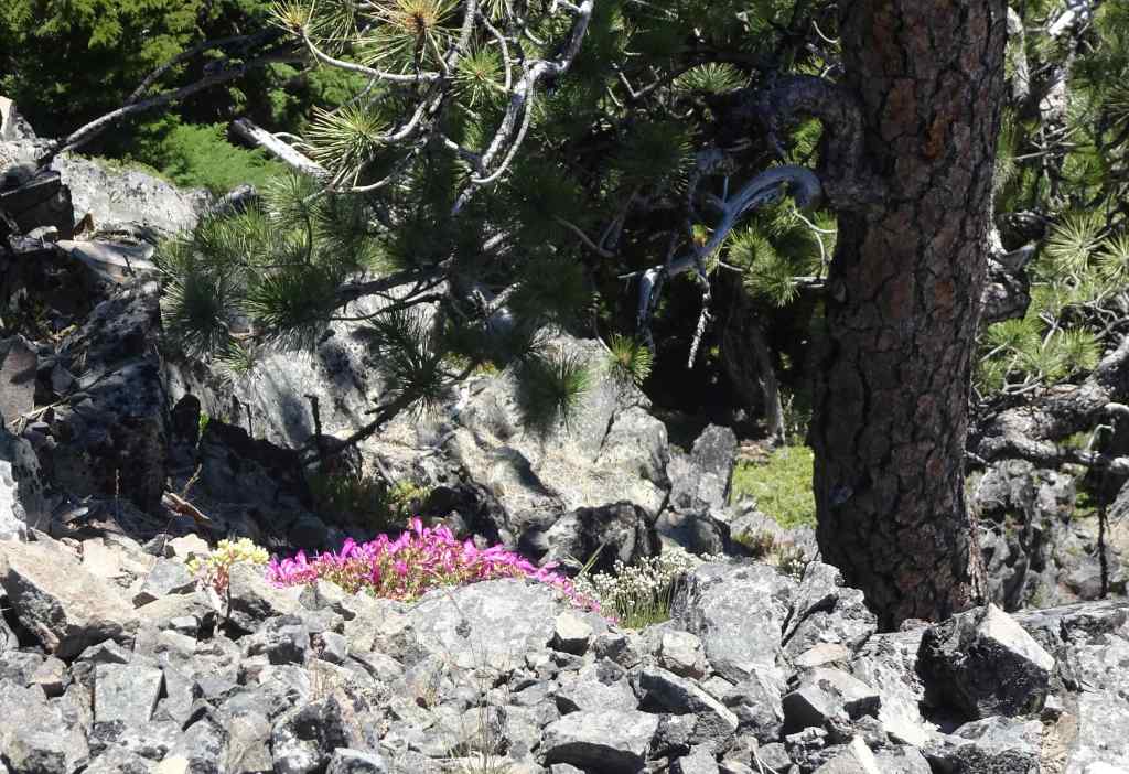 My husband took the side trail to the top of Chinidere Mountain, while I continued a very short distance along the Pacific Crest Trail to the rocky open slope below Chinidere’s cliff side. From here I could see many of the sunny blooming cliff flowers above me, and a view back to Mt Hood the other way. Then I rested in the shade near the trail junction – it was beautiful and quiet in the forest!