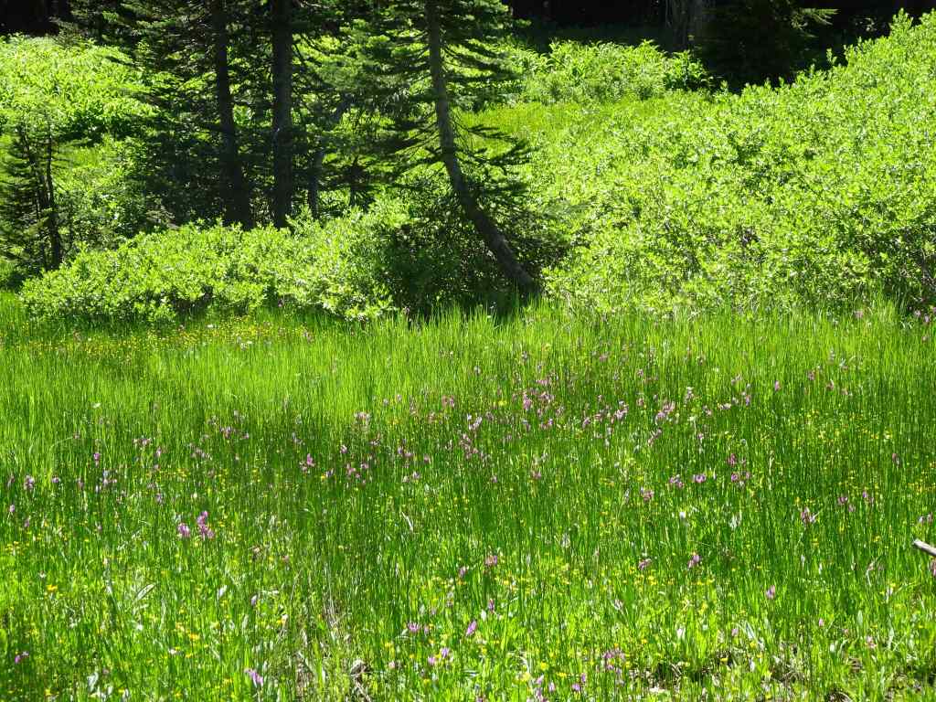 We retraced the trail back to the Trail of Flowers, then down to the Round the Mountain Trail, and continued westward through numerous meadows divided by small creeks that are all branches of Bird Creek.