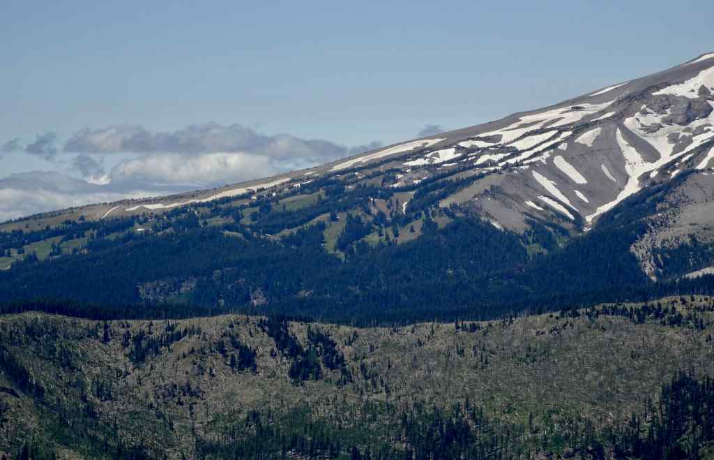 Looking south toward Oregon – blue arrow pointing to the smoke plume from the Burdoin Fire.Closer view of the Burdoin Fire smoke plume.And a wider view across the southern flanks of Mt Adams, and its ghostly forest, burned several times in the past twenty years.