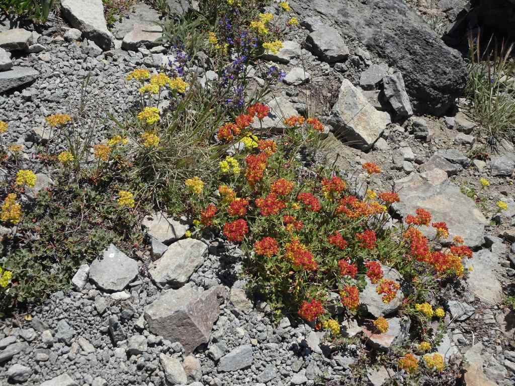 The summit slope has tufts of wildflowers.Sulphurous buckwheat, transitioning from red-orange to yellow.Penstemon and buckwheatDusty maidenAnd a rock wren