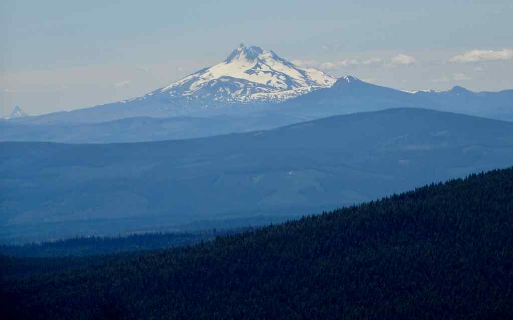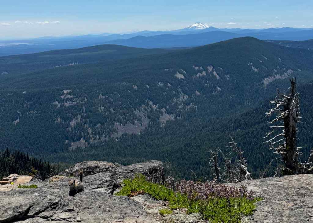 Ascending Picnic Rock – Mt Jefferson off to the right.Closer look at Mt Jefferson and more Cascade Peaks to the south.Looking east toward Bluegrass Ridge (burned in 2006), above Elk Meadows.West toward Mt Hood and Clark Creek.Clark Creek.Stonecrop on Picnic Rock.Penstemon clinging to the face of Picnic Rock.
