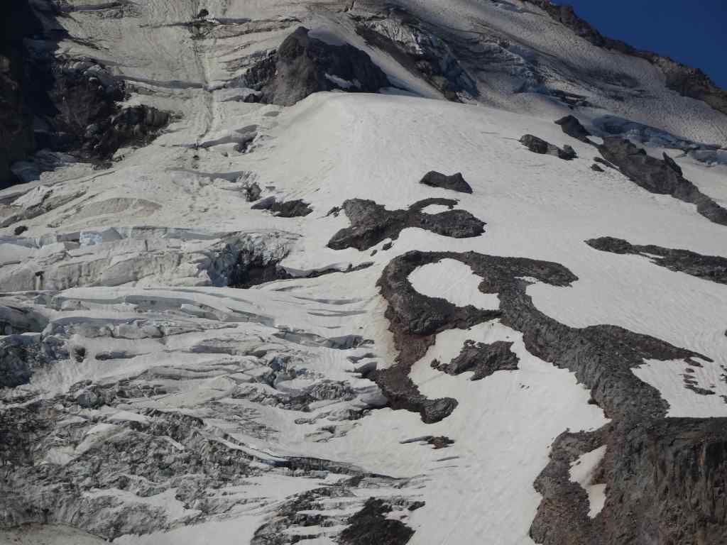From the crest of East Eliot Moraine, our trail goes up hill toward the Eliot Glacier.Eliot Glacier Glacier close upCrevasses