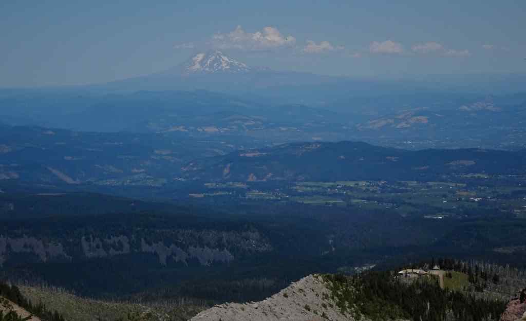 Approaching the Cloud Cap Shelter.Lunch view of Mt St Helens through the haze.Also, Mt Adams to the north, beyond the Hood River Valley; and Cloud Cap Inn, near our trailhead, on lower near right.Cloud Cap Shelter; Cooper Spur and Mt Hood beyond.