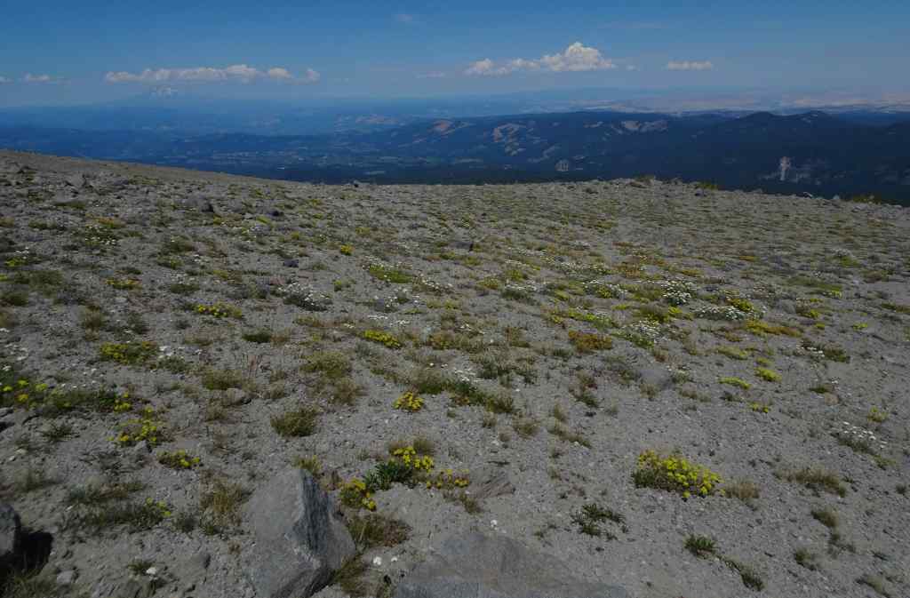 Our trail carved out of the edge of the sky.Tufts of yarrow and buckwheat on the slopes.Yarrow and lupineA last look back at the snow banksPussypawsPenstemon and astersPartridgefoot and Mt Hood.