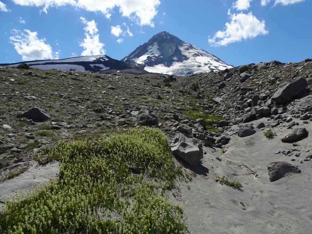 Mt Adams on view from the upward trailSandwort and mariposa liliesHellroaring Viewpoint – top of the mountain back under the clouds.Mazama Glacier Hellroaring Falls