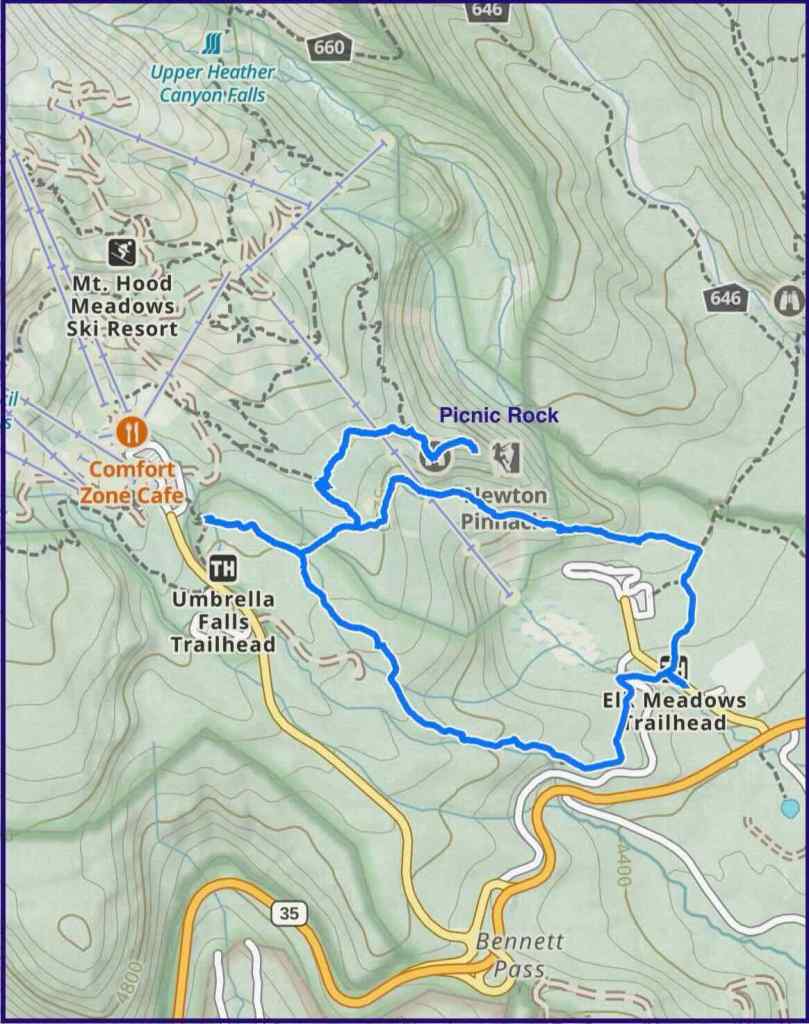 This hike begins at the Elk Meadows trailhead. We walked uphill along flower-filled ski runs of Mt Hood Meadows, and across to the knob called Picnic Rock. We visited Umbrella Falls, then circled downhill through flower-filled forest to complete the loop.